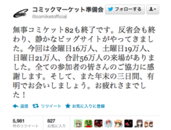 ▽ コミックマーケット準備会 on Twitter: "無事コミケット82も終了です。反省会も終わり、静かなビッグサイトがやってきました。今回は金曜日16万人、土曜日19万人、日曜日21万人、合計56万人の来場がありました。全ての参加者の皆さんのご協力に感謝します。そして、また年末の三日間、有明でお会いしましょう。お疲れさまでした!"