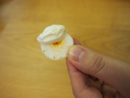 用意したものにひと通り塗ってみた後、スタッフにあらためて感想を聞くと、やはり一番おいしかったのは白い風船だったとのこと。味が濃くないものや、程よくしょっぱいものとの組み合わせがいいようです。逆に、チョコレートのように甘みが強いものと組み合わせると、ホイップアイスの味が消えてしまいました。チョコレートと一緒に食べるときは、ビターチョコレートを選ぶといいかもしれません。