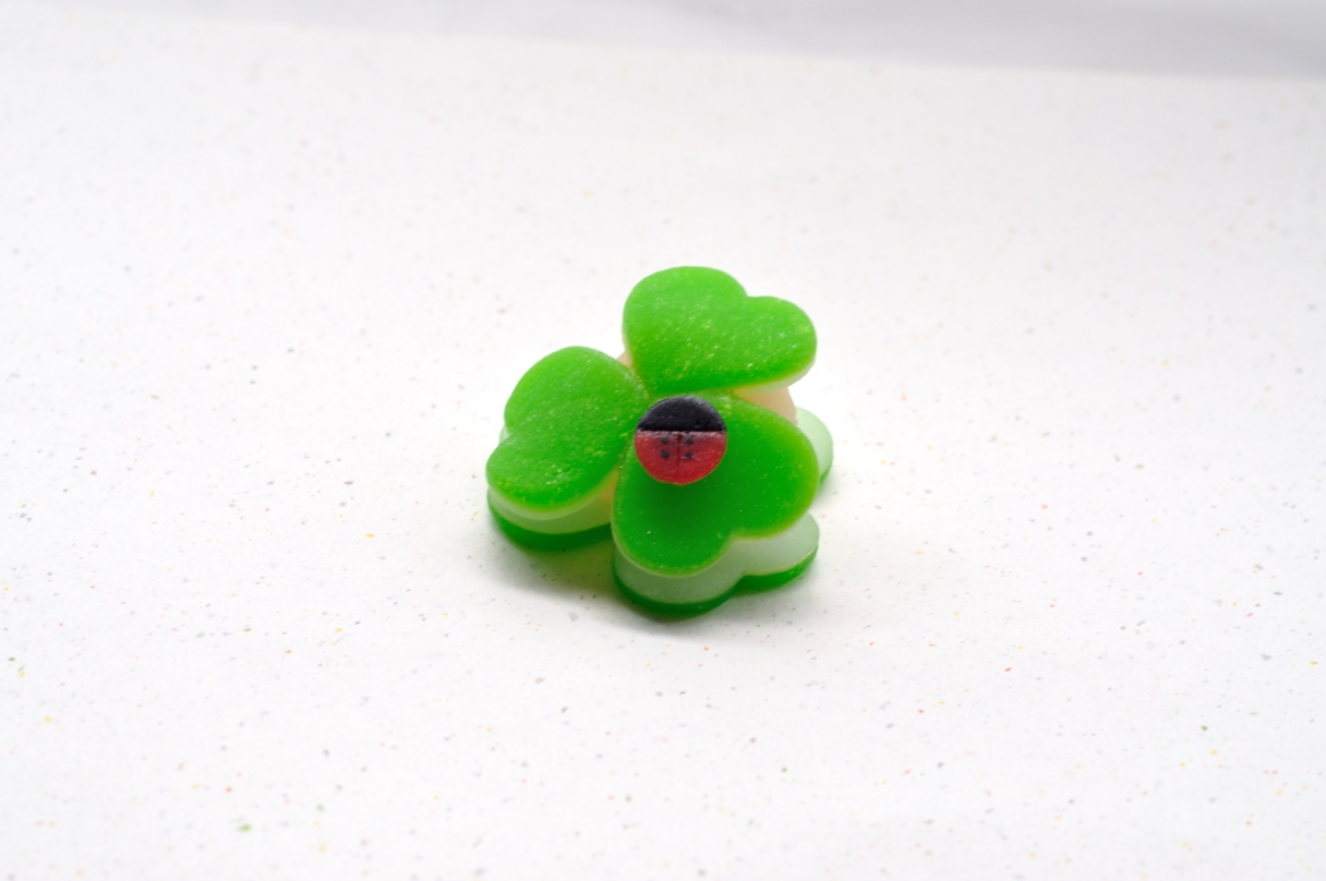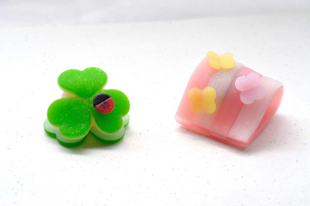 花びらに蝶が止まっているような生菓子と、クローバーとテントウムシをデザインした生菓子の2個が入っています。あんの甘さと、ニッキの風味が絶妙にマッチしていました。