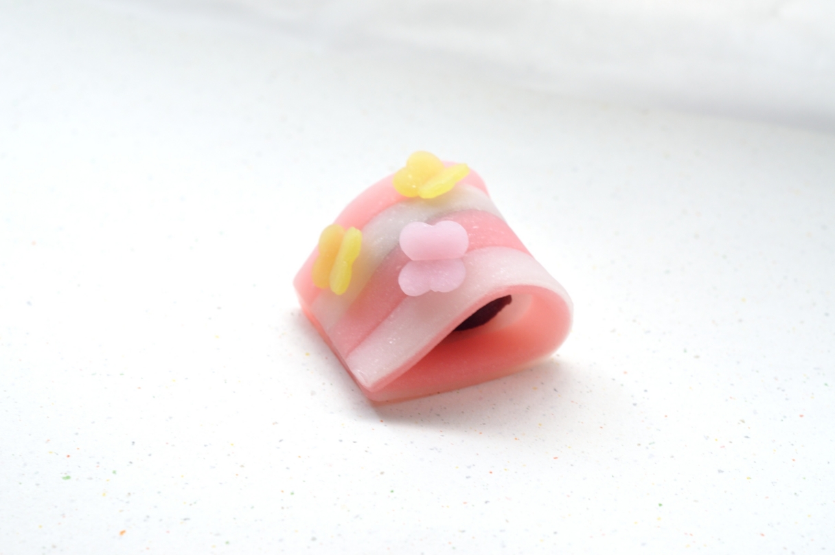 ショーケースに並ぶ個性的な商品の中で気になったのが、季節やイベントごとにモチーフが変わる生菓子。カラフルな生八つ橋でこしあんや白あんなどを包んでいます。筆者が店を訪れたときは、春らしい「printemps(プランタン)」という生菓子が販売されていました。