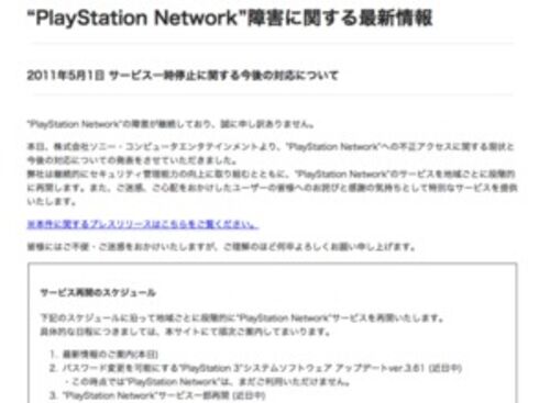 ソニー・コンピュータエンタテインメント(SCE)は5月1日(日)、不正アクセスにより一時停止しているPS3/PSP用ネットワークサービス「PlayStation Network」の今後について、再開のスケジュールやユーザーへの対応などを公式サイト上で発表しました。サー…