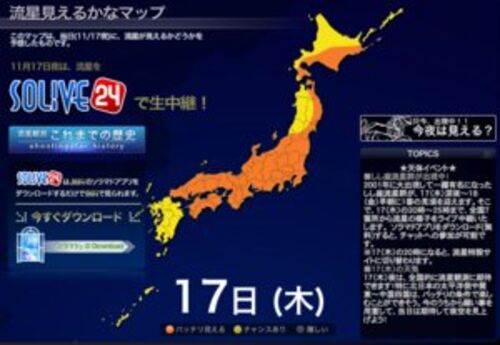 毎年11月中旬ごろに出現する「しし座流星群」が、2011年は11月17日(木)深夜から18日(金)早朝に観測のピークを迎えます。これを受け、気象情報サイト「ウェザーニュース」を運営するウェザーニューズは、観測のチャンスがあると見込まれるエリアを発表し…