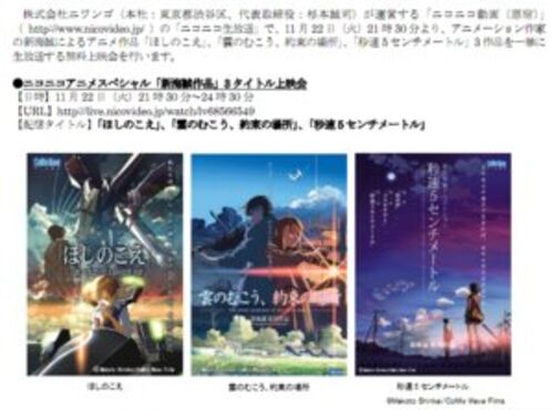 ニコニコ動画を運営するニワンゴは11月22日(火)午後9時30分から、新海誠さんが監督を務めたアニメーション作品「ほしのこえ」「雲のむこう、約束の場所」「秒速5センチメートル」を、ニコニコ生放送で一挙配信します。視聴は無料です。 ▽ ニコニコアニメス…