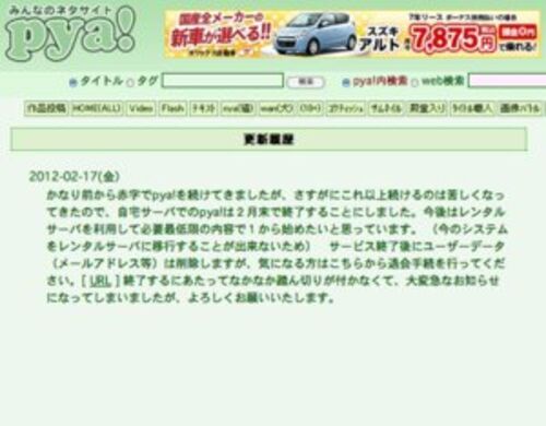 “ネタ画像”などにコメントができるサイト「pya!」が、2月末で自宅サーバーでの運営を終了すると発表しました。同サイトの管理人は今後について、「レンタルサーバを利用して必要最低限の内容で1から始めたい」とコメントしています。 ▽ 大人のネタサイト pya…