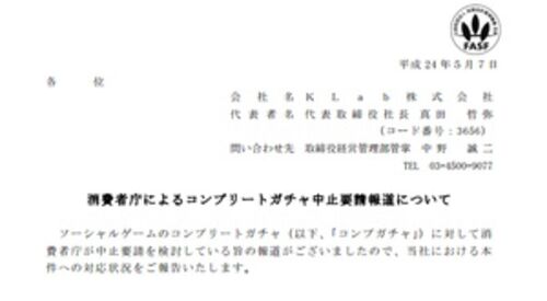 「キャプテン翼モバイル」や「恋してキャバ嬢」などのソーシャルゲームを提供しているKLabは5月7日(月)、消費者庁が「コンプリートガチャ」(コンプガチャ)の中止を要請するとの報道について、対応状況を発表しました。消費者庁から直接の通達はないもの…