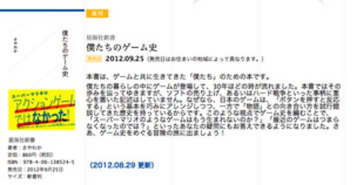 ゲームやアニメ、アイドルなどの分野で活動するライター・さやわかさんの著書『僕たちのゲーム史』が、星海社新書から9月25日(火)に発売されます。価格は860円(税別)です。 ▽ [新刊案内] 2012.08.29 | 僕たちのゲーム史 | 星海社『僕たちのゲーム史』は…