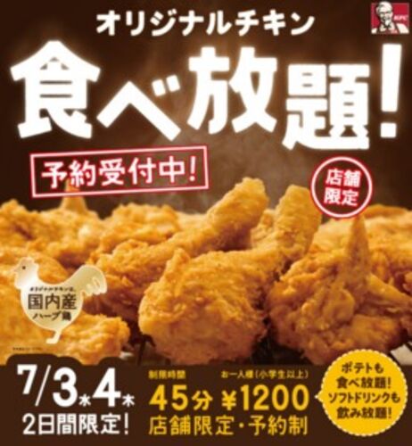 日本ケンタッキー・フライド・チキンは7月3日(水)と7月4日(木)、創業日を記念した「オリジナルチキン」の食べ放題企画を全国565店舗で実施します。開催時間は各日午前11時~午後7時で、制限時間は45分間。完全予約制のため、実施店舗では6月19日(水)か…