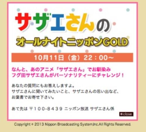 ニッポン放送は、10月放送のラジオ番組「サザエさんのオールナイトニッポンGOLD」に向け、リスナーからの質問をはがきで募集しています。同番組では、アニメ「サザエさん」に登場する主人公「フグ田サザエ」がパーソナリティーを務めるとのこと。放送日時は1…
