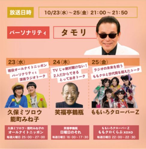 ニッポン放送は10月23日(水)から3夜連続で、開局60周年を記念したラジオ番組「われらラジオ世代」を放送します。パーソナリティーはタレントのタモリさん。1日目は久保ミツロウさんと能町みね子さん、2日目は笑福亭鶴瓶さん、3日目はももいろクローバーZ(…