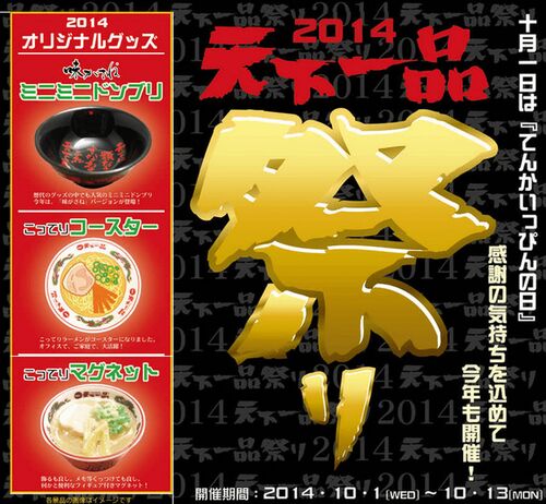 ラーメン店・天下一品は、毎年恒例のイベント「天下一品祭り」を10月1日(水)から10月13日(月・祝)まで開催します。10月1日の「てんかいっぴんの日」には、ラーメンを注文した人にラーメン(並)の無料券をプレゼント。10月2日(木)からは、オリジナルグ…