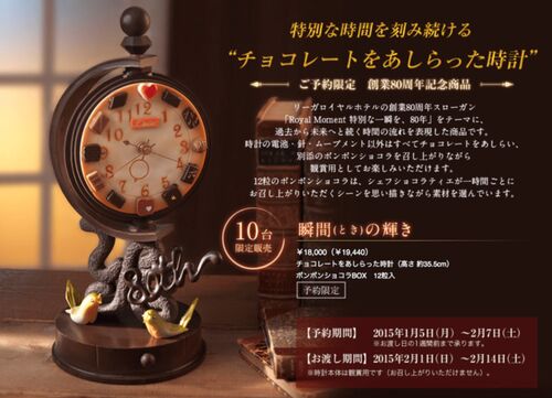 大阪・中之島のリーガロイヤルホテル内にあるチョコレート専門店「ショコラブティック レクラ」は1月5日(月)、チョコレートをあしらった時計とボンボンショコラがセットになったバレンタインデー向けギフト「瞬間の輝き」の予約販売を開始しました。10台限…