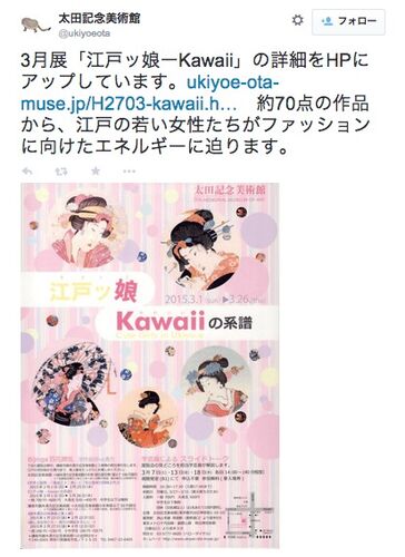 浮世絵専門の太田記念美術館(東京都渋谷区)は、原宿ファッションなどに見られる「kawaii(かわいい)」のルーツを浮世絵で探る展覧会「江戸ッ娘 —Kawaiiの系譜」を開催します。遊女や町娘など江戸時代のさまざまな女性に注目し、豪華な髪飾りやカラフルな…