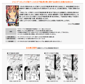 集英社のジャンプスクエア編集部は、先月1月4日に発売された、人気マンガ「新テニスの王子様」のコミックス第2巻に編集ミスがあったことを公式サイトで発表しました。現在、加筆修正されたものと無償での交換を受付けています。