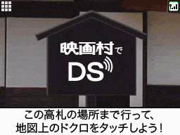 ゲームを始める前に、まずは入り口付近などにあるこの高札を探します。高札の下に書かれた案内と画面の指示に従って、DSで「ニンテンドーゾーン」が利用できるように設定します。(映画村でDSは、ニンテンドーDSi /DSi LLまたは ニンテンドーDS・DS Lite で利用可能です。 使用できない機種もあります。)