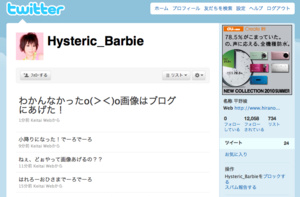 本日6月23日(水)はニューシングルとライブDVDの発売日ということで、昨晩自身のブログで「明日の発売日のみツイッターをやるょ!試しにいっこあげてみた。」と報告した平野さん。アカウント名は新曲のタイトルと同じく「Hysteric_Barbie」で、早速プライベートでの出来事をつぶやいたり、「ねぇねぇ、みんないつもこのくらいの時間に起きてるの?」とフォローしてくれたファンに質問をする場面も。フォロワー数は本日11:30現在で11,900人を超え、「はっΣ(゜ロ゜ノ)ノ起きたら一万越えしとる!!ありがとぉ♪」「一万一千越え わーぃ」と、その勢いには平野さん自身も驚いたようです。