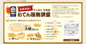 「おでん国勢調査」は、サッポロビールが冬期限定で販売している「サッポロ冬物語」のキャンペーンで行っていた“おでんの楽しみ方”についてのアンケート調査。投票期間を終え、公式サイトでは「あなたが一番好きなおでんの具は何ですか?」「普段どこでおでんを食べることが多いですか?」「一番好きなおでんの薬味は?」といったアンケートの結果が発表されています。