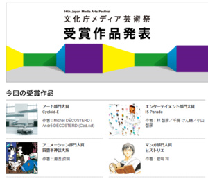 そのほかの大賞は、アート部門が音響彫刻「Cycloid-E」、エンターテイメント部門がTwitterを用いたジェネレーター「IS Parade」、マンガ部門は岩明均さんの『ヒストリエ』が受賞しています。また、アニメーション部門の優秀賞には、以前はてなブックマークニュースでも紹介した自主制作アニメ「フミコの告白」も選ばれています。
