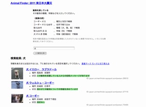 東日本大震災で被災したペットの消息を検索・登録できる2つのWebサービスが、4月14日(木)からスタートしました。Googleは「アニマルファインダー」、日本マイクロソフトは「MSN ペットサーチ」で、ペットの写真や特徴、保護した場所などを提供しています。