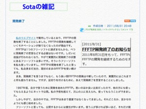 FTPクライアントソフト「FFFTP」の作者で知られるSotaさんは8月31日(水)、同ソフトの開発を終了したと公式サイトで発表しました。開発終了の理由について、Sotaさんは「FFFTPの開発を継続していくモチベーションが保てなくなった」とコメントしています。