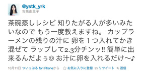 簡単な得意料理を振る舞うというシーンで吉高さんが紹介したのは、日清「カップヌードル」のスープで作る“茶わん蒸し”です。作り方は、残り汁に卵を1つ入れてかき混ぜたあと、別の容器に移してラップをし、2~3分レンジにかけるだけです。吉高さんは以前にも別のテレビ番組でこのレシピを紹介しており、10月にはTwitterの公式アカウントに作り方を投稿しています。