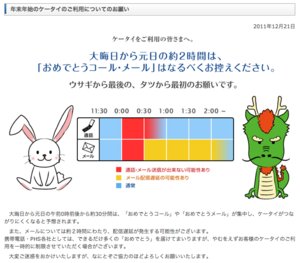 文書を発表したのは、電気通信事業者協会、NTTドコモ、KDDI、ソフトバンクモバイル、ウィルコム、イー・アクセス(イー・モバイル)です。発表によれば、元日の午前0時前後から約30分間は「おめでとうコール」や「おめでとうメール」が集中するため、携帯電話がつながりにくくなることが予測されるそうです。