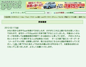 「pya!」は、投稿された画像やFlash、動画、テキストなどに評価やコメントを付けられるWebサイトです。2003年4月に最初の作品が投稿されて以降、約9年にわたって運営されていました。自宅サーバーでの運営終了は、2月17日付で掲載された更新履歴の中で告知されました。管理人のpya!さんは、終了の理由について「かなり前から赤字でpya!を続けてきましたが、さすがにこれ以上続けるのは苦しくなってきた」と説明しています。