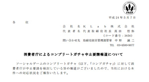 「キャプテン翼モバイル」や「恋してキャバ嬢」などのソーシャルゲームを提供しているKLabは5月7日(月)、消費者庁が「コンプリートガチャ」(コンプガチャ)の中止を要請するとの報道について、対応状況を発表しました。消費者庁から直接の通達はないものの、中止が要請された場合は全面的に従うとしています。