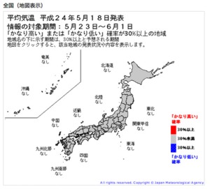 気象庁は5月31日(木)から、最高気温が35度以上になると予想される地域に向け、「高温注意情報」を発表します。2012年は、北海道と沖縄を含む全国が対象です。1週間の平均気温が平年よりかなり高い場合に発表する「高温に関する異常天候早期警戒情報」は、5月18日(金)から開始します。