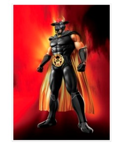 「黒牛ヒーロー」は、黒いヒーロースーツに身を包み、金色のマントをなびかせています。全体的に筋肉質な体型で、頭には角が生えた黒牛のマスクを装着。腰には「黒牛」と書かれたチャンピオンベルトのようなものを巻いています。
