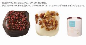 ハッピーファンでは、メープル味または木苺味の生地に、ブルーベリー、木苺、ミルクのうち好きなパウダーを1種類振り掛けます。価格は、10個入りで368円です。ハッピーシフォンは、口の中でとろける食感が特徴とのこと。チョコレートで包み、アーモンドやストロベリーパウダーをトッピングしています。「ミルクチョコレート&ストロベリー」「ホワイトチョコレート&アーモンド」の2種で、価格は7個入りで各840円です。