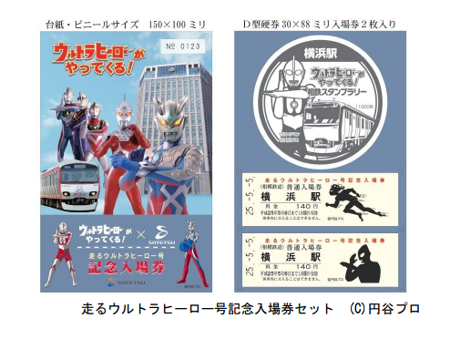 ラッピング列車の運行を記念し、4月27日(土)から5月6日(月・休)まで、7,000セット限定で「走るウルトラヒーロー号記念入場券セット」が発売されます。価格は280円(税込)。発売駅は、横浜、二俣川、三ツ境、大和、海老名、緑園都市、湘南台の7駅です。発売駅名の硬券入場券2枚に、ウルトラヒーローがポーズを決めた台紙が付きます。売り切れ次第、販売を終了します。