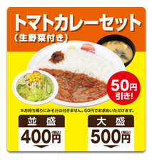 発売を記念し、生野菜付きのトマトカレーセットが、通常価格から50円値引きされます。値引き後の価格は並盛りセットが400円(税込)、大盛りセットが500円(税込)。期間は6月6日(木)午後3時までです。