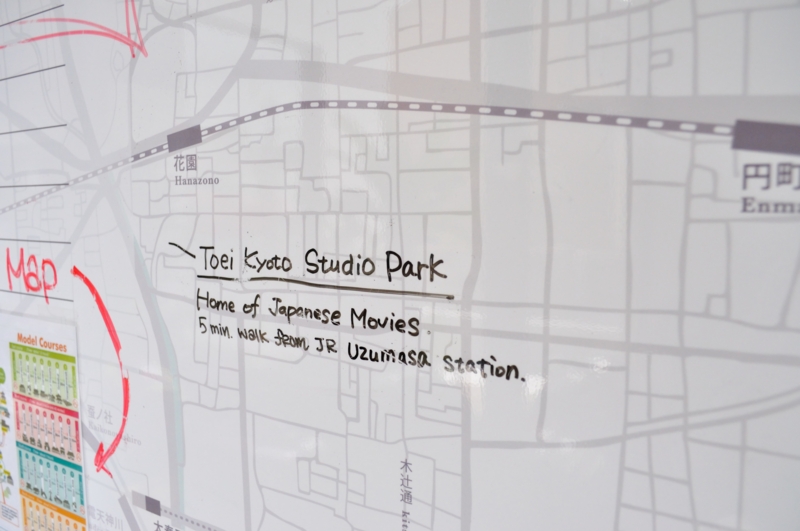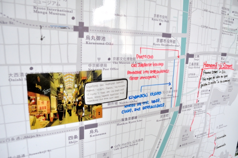 キッチンスペースにある大きな京都市内のマップ。ホワイトボードになっており、魅力的なスポットやイベントの情報などが書き込まれています。