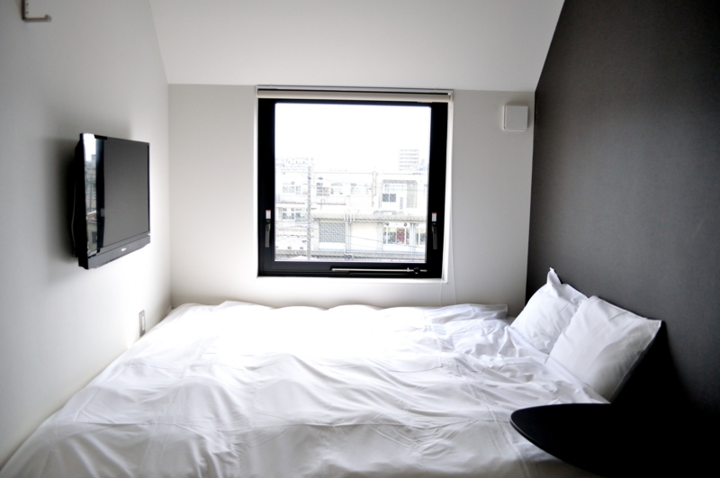個室はファミリー用のほか、シングル、ツイン、ダブルの計4タイプ。ベッドと洗面台、サイドテーブル、スツールを備えた、シンプルな空間です。ツインはシングルサイズの2段ベッド、ダブルはキングサイズのベッドです。
