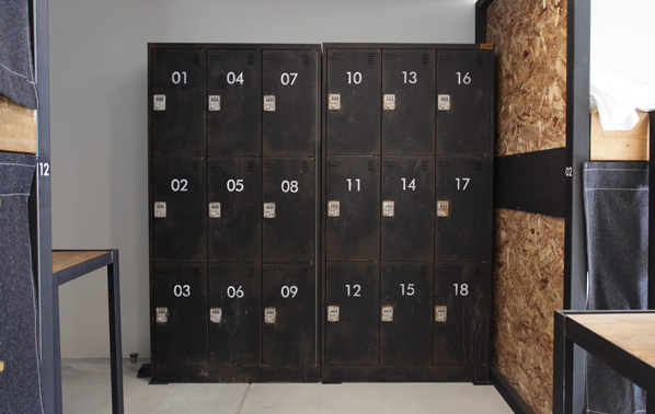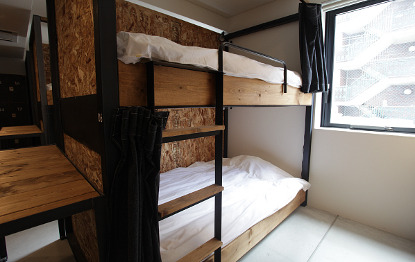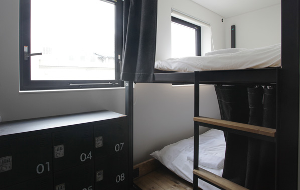 こちらは、2段ベッドが9つ設置された、男女混合の相部屋「18人部屋ドミトリー」。ナンバーキー付きのロッカーや荷物置き場を備え付けているほか、各ベッドに読書灯、コンセントなどを設置しています。携帯電話などが置ける枕元の棚や洗濯物が干せるワイヤーなどは、利用客の要望をもとに、オープン後に備え付けられたそう。入り口以外の三方は仕切られており、カーテンを閉めれば他の利用者の目線が気になりません。料金は2,300円からです。