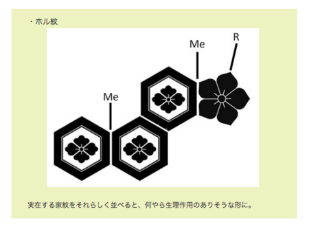 中には、既存の家紋を組み合わせた「ホル紋」も。佐藤さんは「実在する家紋をそれらしく並べると、何やら生理作用のありそうな形に」と説明しています。加えて「研究している分子をモチーフにして、家紋ならぬラボ紋なんてものをデザインしてみるのも、なかなか乙ではないかと思います」とも提案していました。