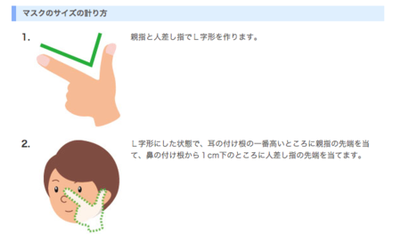 親指と人さし指でL字型を作り、耳の付け根の一番高いところに親指の先端、鼻の付け根から1cm下のところに人さし指の先端を当てます。その時の親指から人さし指までの長さが、マスクのサイズの目安。長さが9~11cmなら子ども用サイズ、10.5~12.5cmは小さめのサイズ、12~14.5cmは普通のサイズ、14cm以上は大きめのサイズがオススメだそうです。