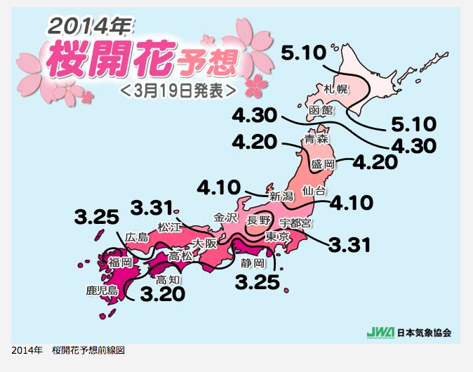 日本気象協会によると、2014年はほぼ平年並みか平年より早く開花を迎えるところが多いとのこと。3月26日(水)現在の予想満開日は、福岡で3月28日(金)、東京で4月1日(火)、大阪で4月4日(金)、宮城で4月15日(火)です。関東以西では、4月のはじめごろから花見が楽しめるそうです。