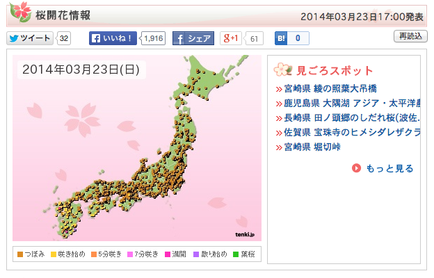 九州・四国地方から徐々に開花し始め、2014年も桜の季節がやってきました。これから満開に近づいていく桜の見ごろを逃さないために、各地の開花情報や満開予想日などが調べられるサイトをまとめました。花見のスポットも紹介しています。