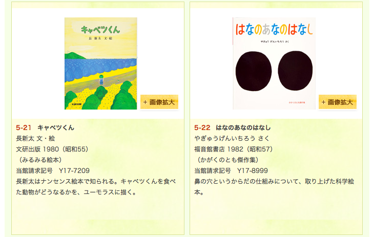 「国語教科書と児童文学」のページでは、『ちいちゃんのかげおくり』(あまんきみこ作、上野紀子絵)『ごんぎつね』(新美南吉作、黒井健絵)『やまなし』(宮沢賢治作、遠山繁年絵)など、小学校の国語の教科書に掲載されている児童文学も紹介しています。