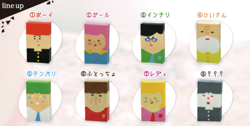 ラインアップは「ボーイ」「ガール」「インテリ」「じいさん」「テンパリ」「ふとっちょ」「レディ」と、シークレットを合わせた全8種類。それぞれに特徴を表したかわいらしい表情が描かれています。