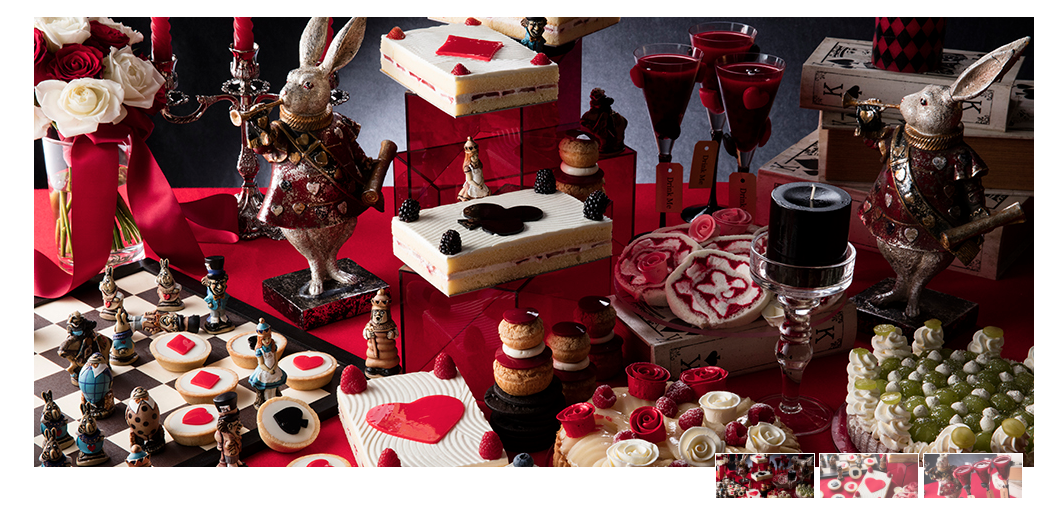 白いバラを赤いペンキで塗るトランプたちのエピソードから誕生した「赤く塗っちゃえローズ・ロールケーキ」は、あふれんばかりのベリークリームをバラの香りが漂うスポンジで包んだ一品。トランプの模様を描いた「ホワイトチョコのトランプ・タルト」では、ホワイトチョコレートガナッシュに加え、ブルーベリー・ストロベリー・ラズベリー・チェリーという4種類のフレーバーを堪能できます。このほか、女王様の口癖「首をはねておしまい」をイメージしたデザート、真っ赤なチョコレートファウンテン「赤の女王の泉」などを用意。かわいいだけではない、少し大人のアリスの世界観が楽しめます。