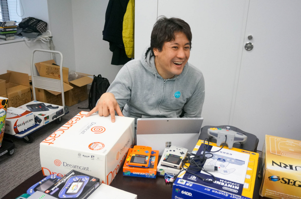 机に並べられたゲームのうち9割くらいが齋田さん所有のもの。ハドソン、スクウェア(途中からスクウェア・エニックス)、ヤフーを経て、現在はKDDIグループのmedibaでゲーム事業を担当。ネトゲ廃人で大学を辞め「業界に責任を取って貰おう」とゲーム業界に潜り込んだのが最初らしい。今回の企画をヨッピーから聞いて「ゲーム機を貸してやるから混ぜろ」と強引に割って入ってきた。